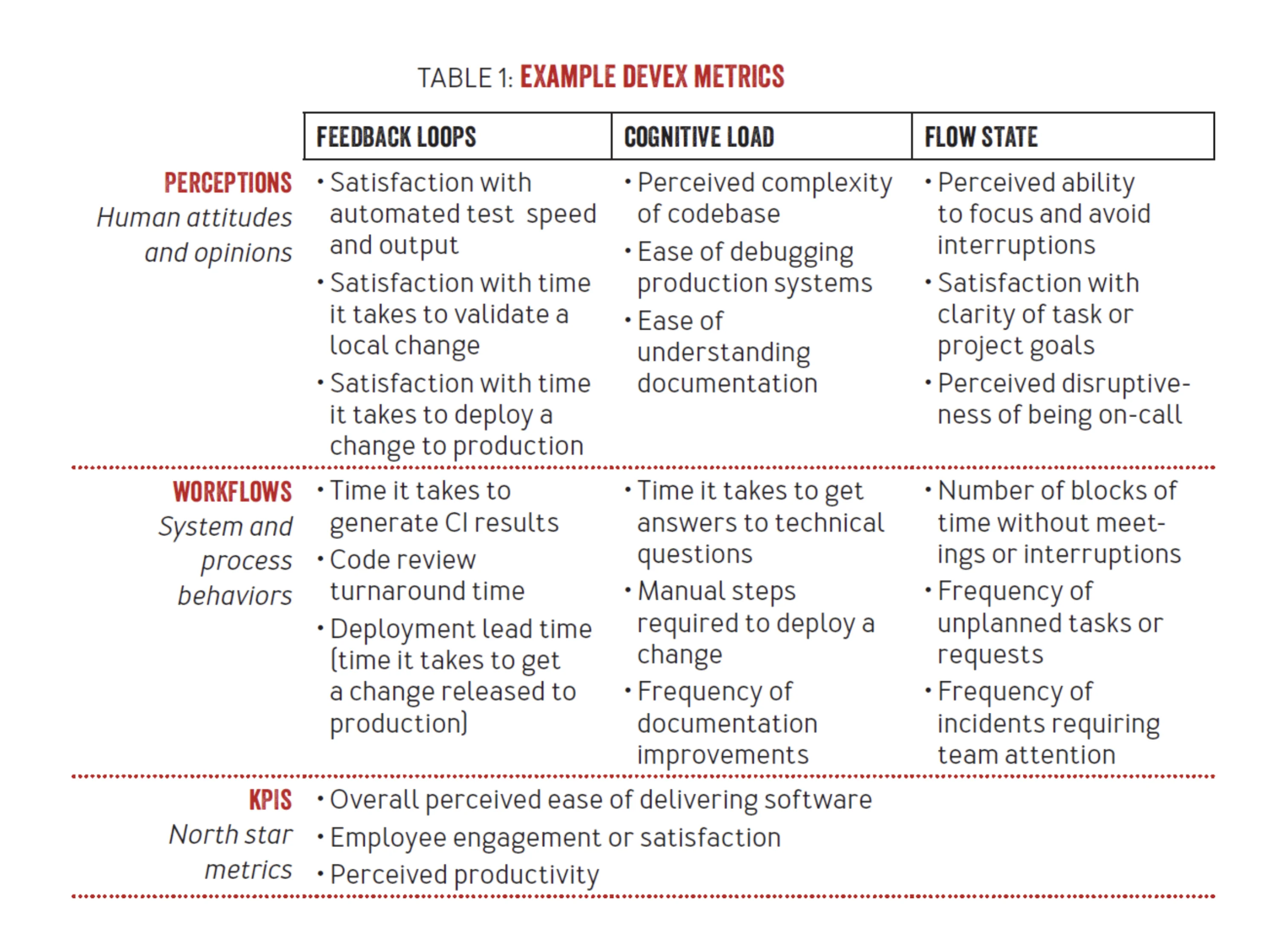 <figure><img src="https://1588585907-files.gitbook.io/~/files/v0/b/gitbook-x-prod.appspot.com/o/spaces%2F-MTwgToRvLjYdjfpAVgP%2Fuploads%2FAzNO1dZk0MCjUjEBFmBv%2Fimage.png?alt=media&#x26;token=197fcfd5-190c-4ba0-a2e7-7135cb04c558" alt=""><figcaption><p><a href="https://www.infoq.com/articles/devex-metrics-framework/">https://www.infoq.com/articles/devex-metrics-framework/</a></p></figcaption></figure>